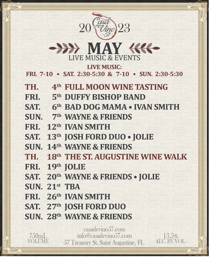 St. Augustine does not lack for live music options—there is always something going on. The weather this weekend was so beautiful we decided to go out for lunch and do a Music Crawl – similar to a bar crawl, but live music is involved…you knew that. Phil had a list of venues, performers, and times in his pocket. In theory we were going to listen to music from 2:00 in the afternoon until Midnight. First stop Meehan’s Backyard for lunch and Dewey Via. If you haven’t seen him—solo or with his band – check him out. The band is at the Dog Rose Brewery every Sunday. I had the Wedge Salad and Phil had the Fish and Chips (can’t go wrong with that choice). From there we walked to Casa de Vino 57 on Treasury. Phil had a beer, I had a glass of Italian Red. We sat under the pergola and listened to the band. Tray and Josh were the duo playing, drums and guitar; mostly country mixed with a bit of rock. They are there every other Sunday. During their break they sat with us, and they shared their cheese plate with us. The triple crème brie was amazing! After their set we went home; because a friend called saying he was in town; so, change of plans—Music Crawl cut short. But there are many weekends ahead for a future Music Crawl(s). Stay tuned…